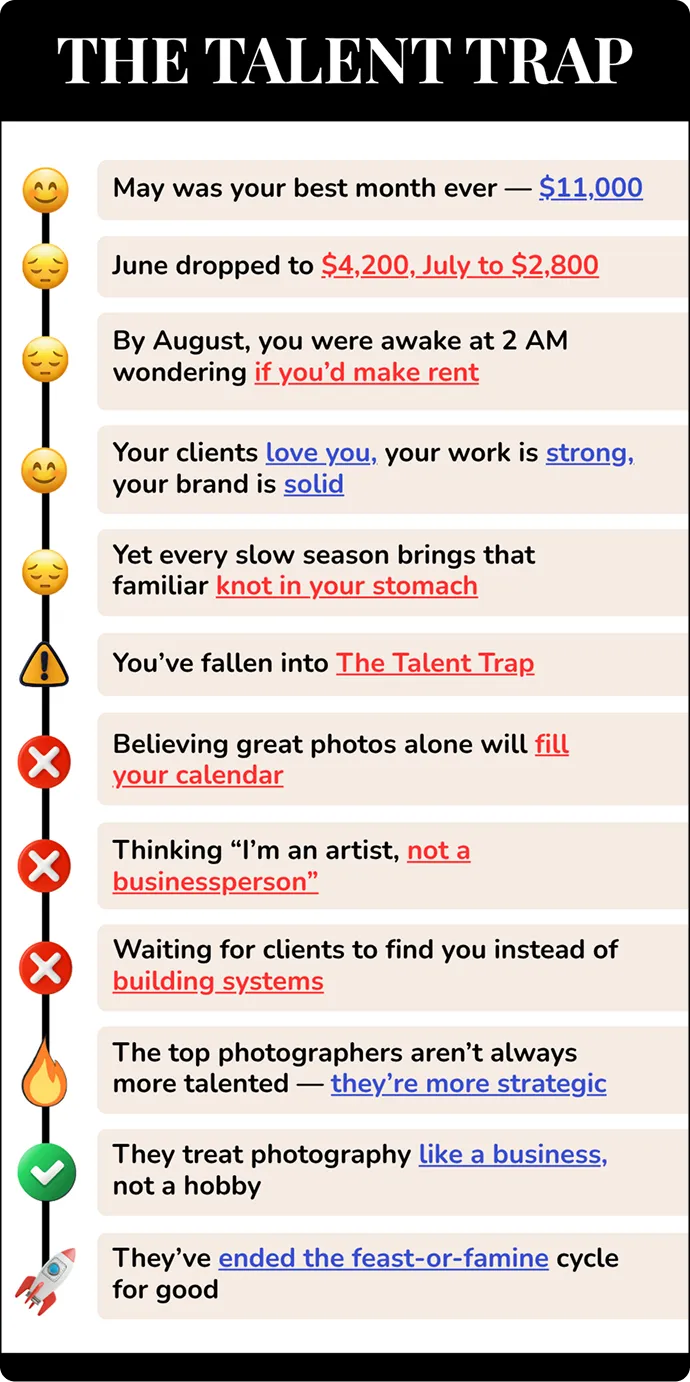 The photographers making $150K+ per year often aren't more talented. Many have average work — but fully booked calendars.
